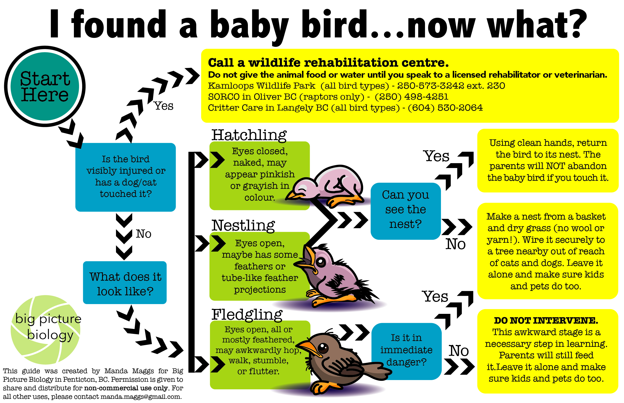 Details on each step are outlined below the infographic. Please feel free to share on social media or download. The contact information given is specific to the Okanagan region of BC. Please be aware that in Canada and many other regions in the world, only licensed wildlife rehabilitation centres and some animal shelters or veterinarians may keep or treat wildlife.